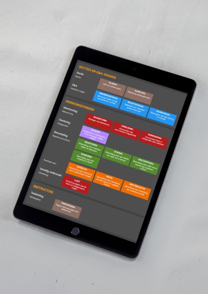 Door deze werkomgevingen slim met elkaar te combineren, bouw je een krachtige en stapsgewijze aanpak voor besluitvorming. Zo kan een idee dat eerst in een brainstorm ontstaat, via clustering en beoordeling leiden tot een concrete keuze en uiteindelijk uitgewerkt worden in een lijst.